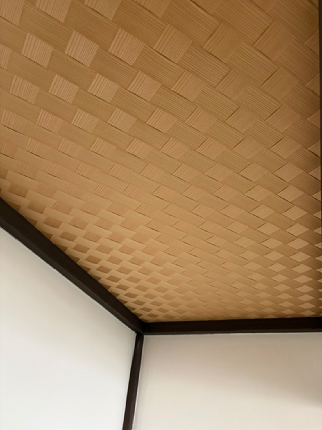 天井には、木の皮を薄く裂いて編み上げる伝統技法「網代(あじろ)」を用いた網代天井を施工。撓みやほつれが生じないよう、素材の特性を熟知した職人が細部まで配慮しながら取り付けています。