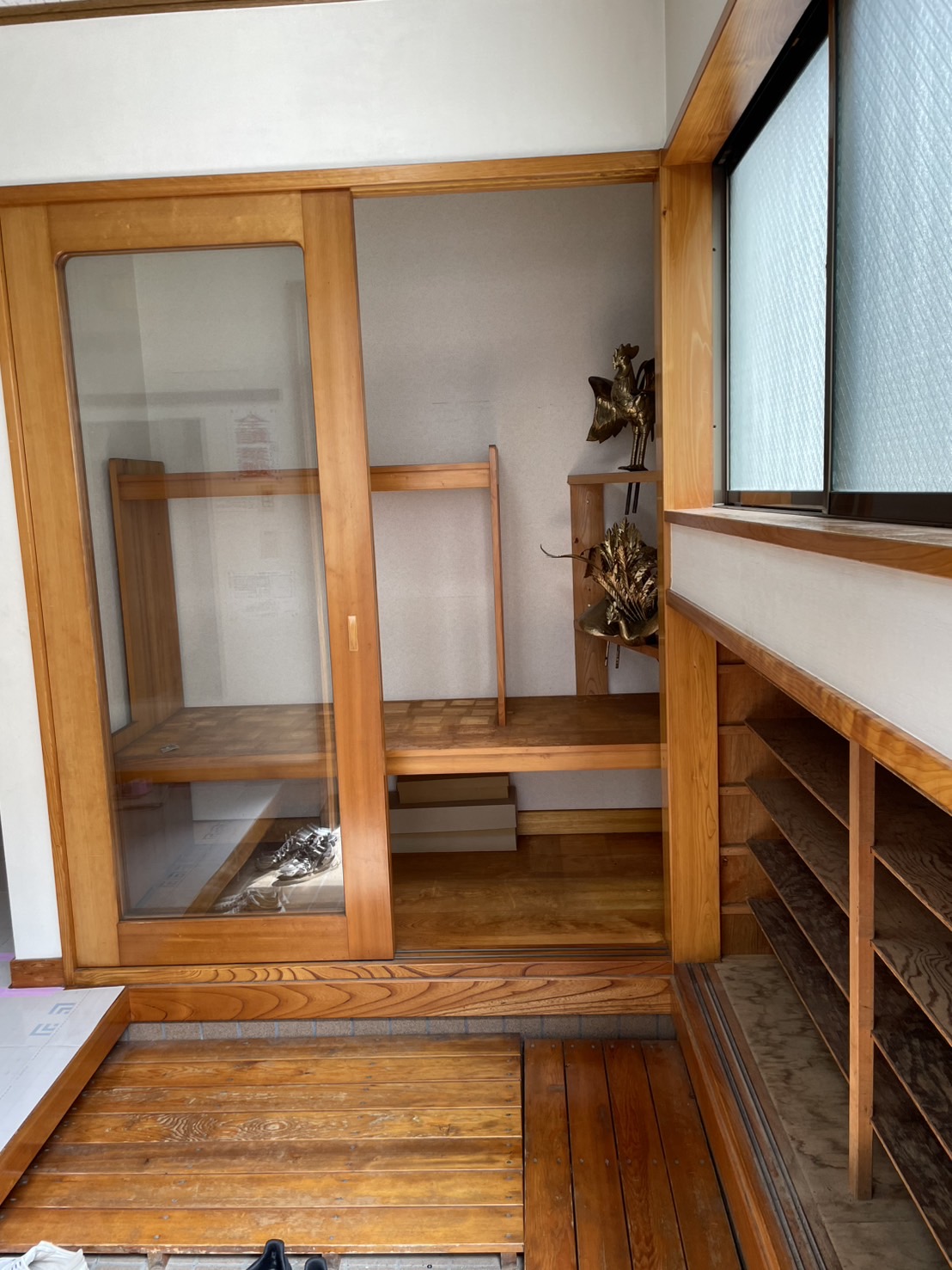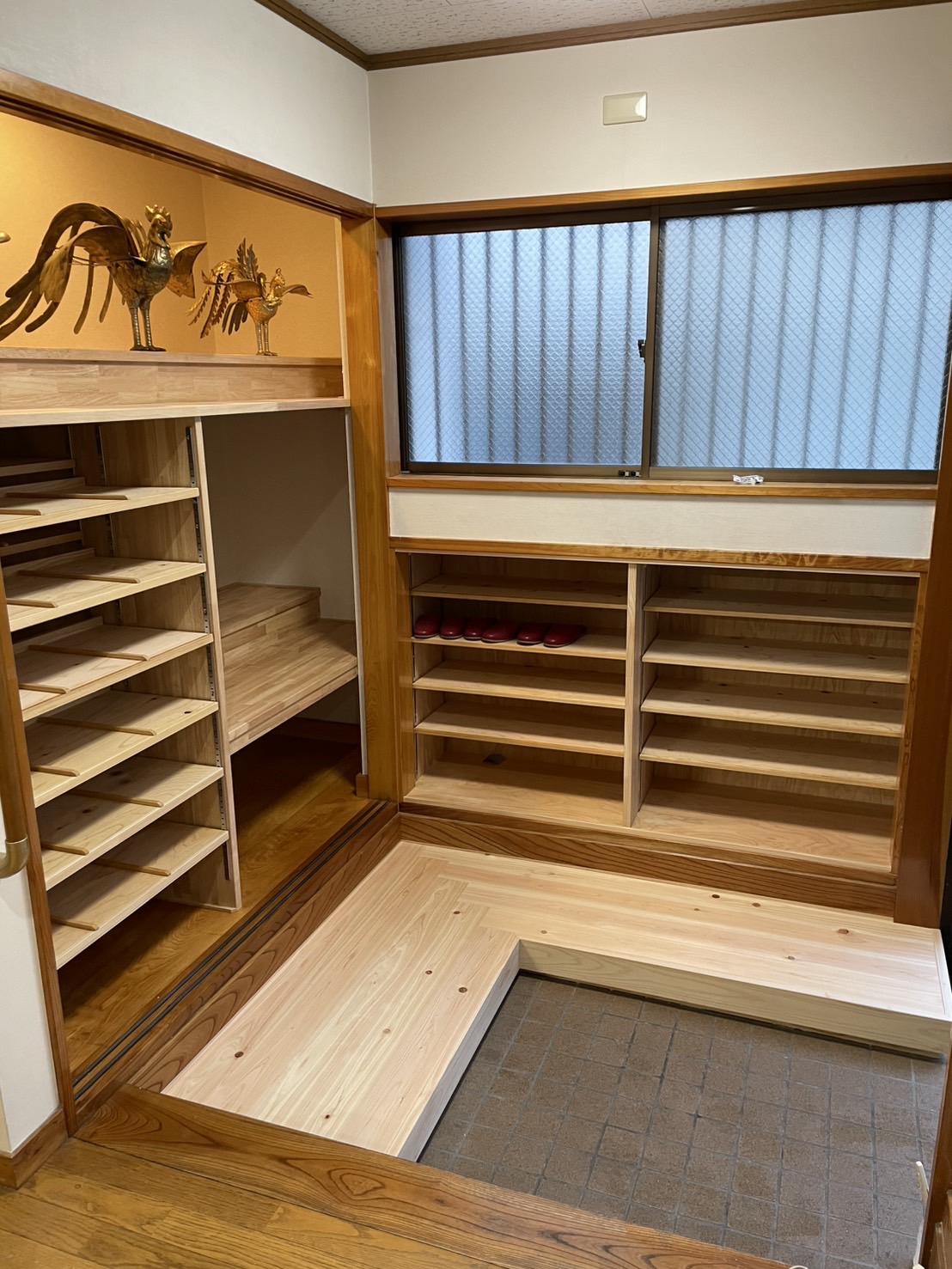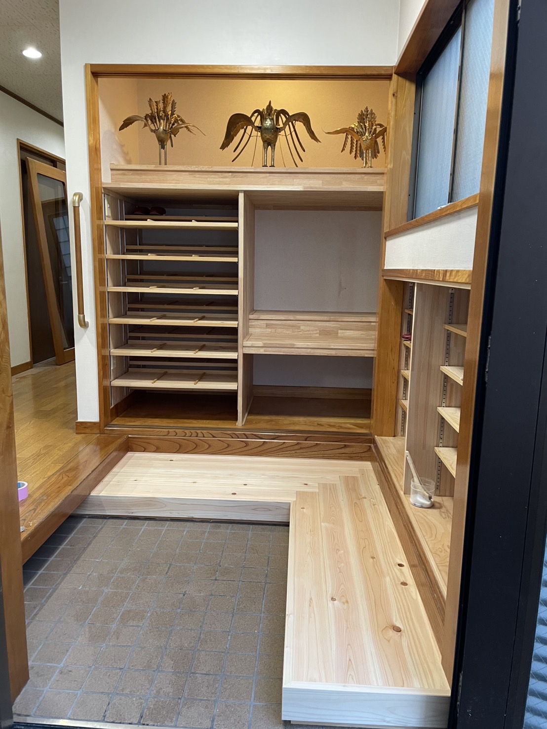 そこで、玄関正面の収納棚を増設。上段は飾り棚として、神輿飾りや優勝カップなどを展示できるスペースとしました。既存の照明を活かし、スポットライトのような演出効果を持たせることで、展示物がより引き立つ空間に仕上げています。